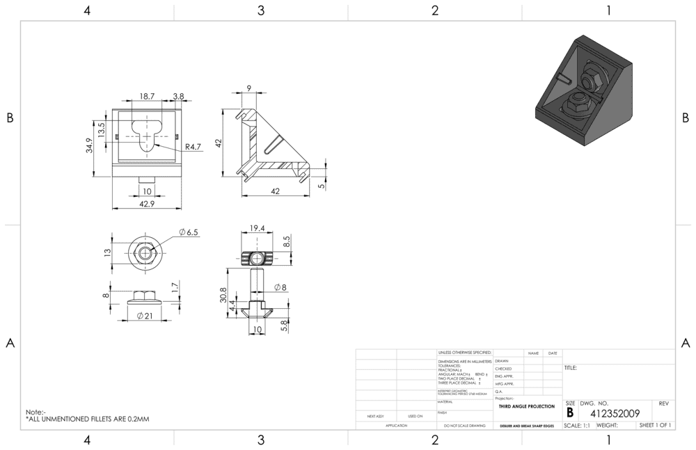 Winkel 43 × 42 inkl. Befestigung, Nut 10, inklusive Befestigung Nut 10/10