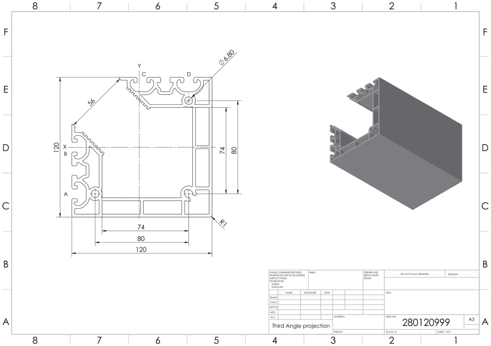 X Profil mit integriertem Kabelkanal 56mm, 120x120 mm, Nut 8
